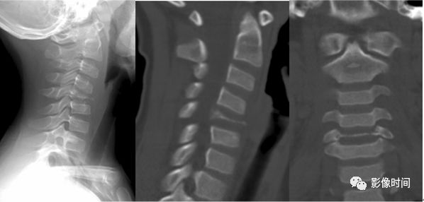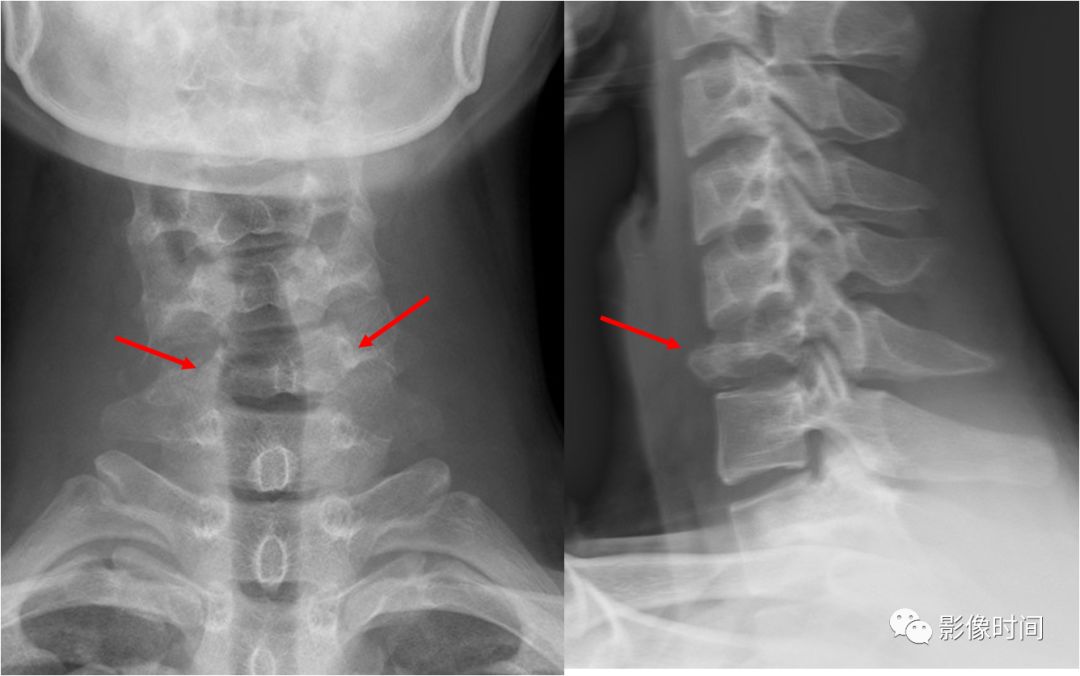 病例 1,18 岁男性,嗜酸性肉芽肿(朗格汉斯细胞组织细胞增生症 LCH)。X 线片示颈 6 椎体变扁,呈现硬币征,其横径及前后径均增大,椎间隙相对增宽。
