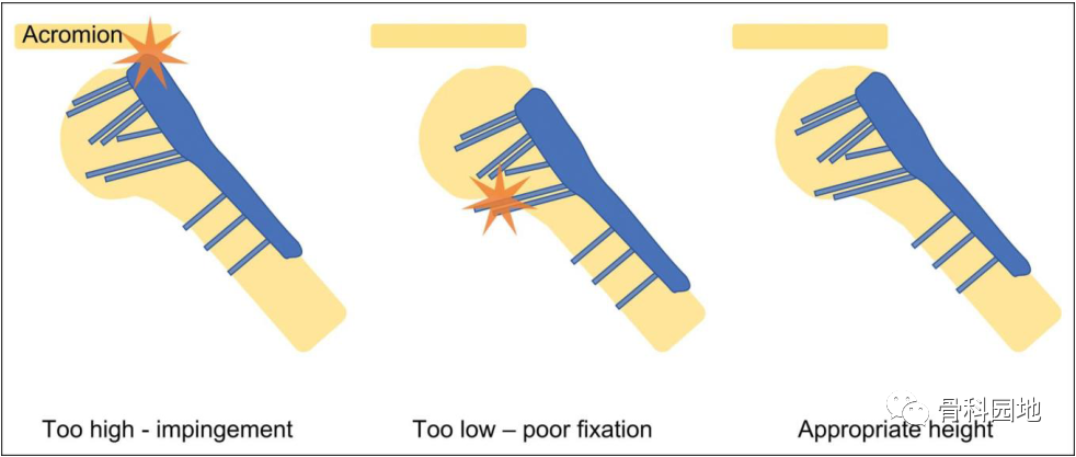 注:近端位置的错位可导致肩峰下撞击。远端位置的错位会导致固定不良和错失距螺钉。