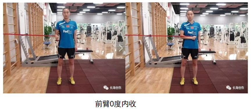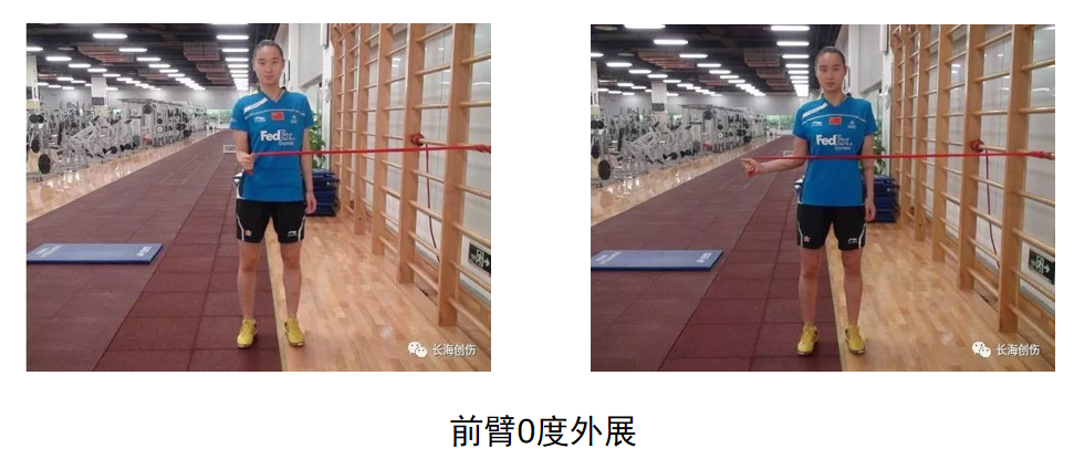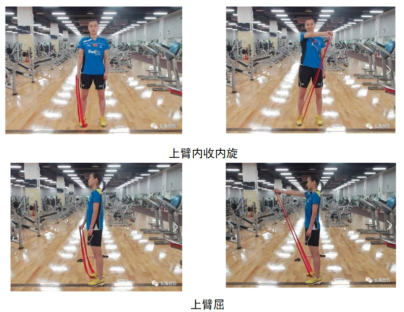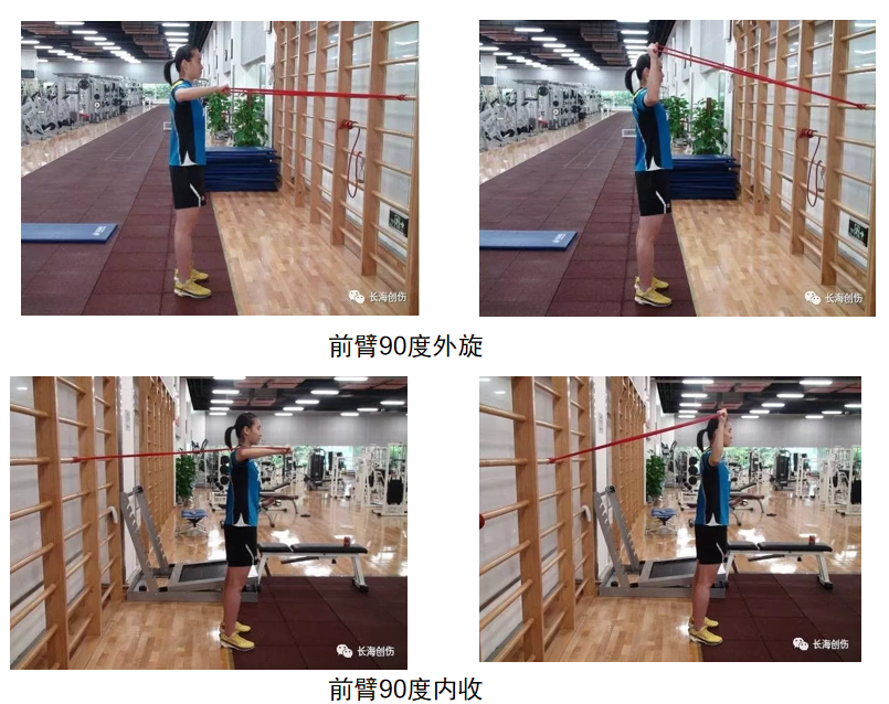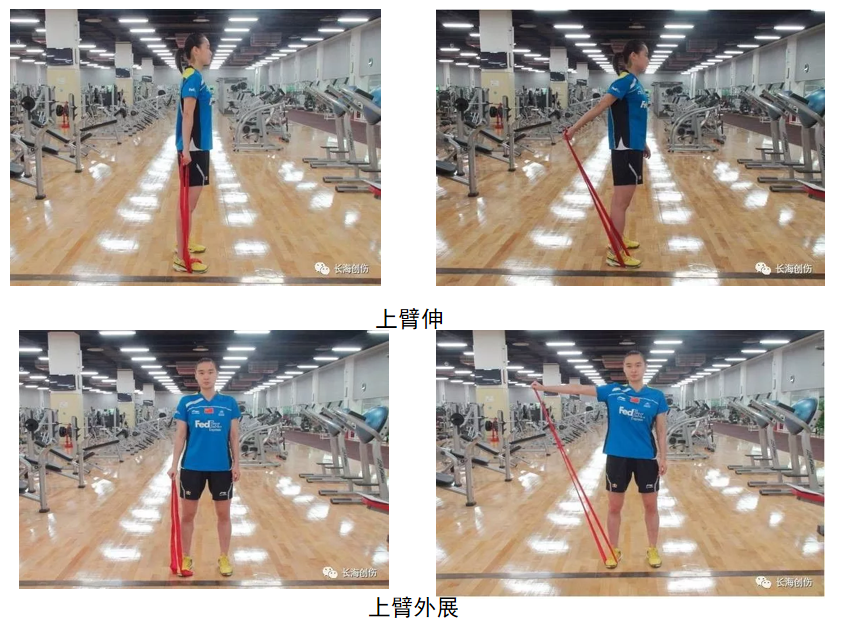 如果肩袖受伤,可以依照图示,进行几种帮助肩袖损伤康复的简单练习。准备一个弹力带,将它固定于墙壁、门或者脚下。每周练3-4次。开始阶段,每个动作5-6次为一组,做1-2组;随后可根据恢复情况增加训练强度,练习次数可逐渐增加至每个动作10-12次为一组,做2-3组。