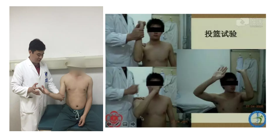 外旋滞后试验:患者背对检查者,肘关节被动屈曲90°,检查者维持患者肩关节前屈20°并最大外旋位,检查者放松腕部后,嘱患者维持上肢位置,如不能维持为阳性。同样是检查冈下肌和小圆肌的功能。(类似投篮试验及吹号角试验)。