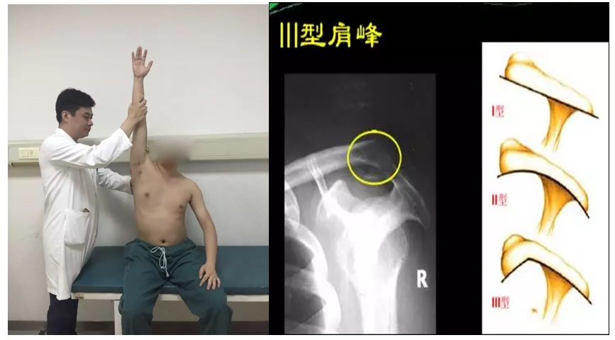 Neer征:患者取坐位,检查者稳住肩胛骨的同时,将患肩大幅前举,导致大结节与肩峰相撞击。是肩袖损伤的重要病因之一,尤其是冈上肌损伤往往伴有肩峰下撞击征阳性表现。(疼痛弧60°-120°)