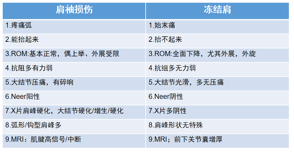 肌力、活动度降低:主要为主动上举(包括外展和屈曲)、外旋和内旋力量的减弱和活动度的降低。但被动活动范围无明显受限。表现为洗脸、梳头、穿衣、拿放高处的物品以及驾驶等日常活动的困难。