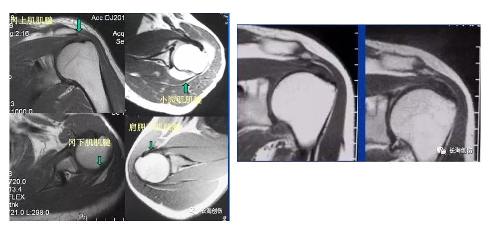 核磁共振:MRI不但可以显示肩袖损伤的程度、范围、肌腱回缩、脂肪浸润和肌肉萎缩等情况,还可以显示肱二头肌长头腱、肩峰形态、肩峰下间隙、肩锁关节等更多的信息。