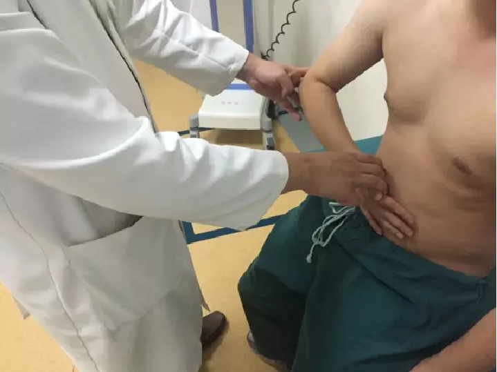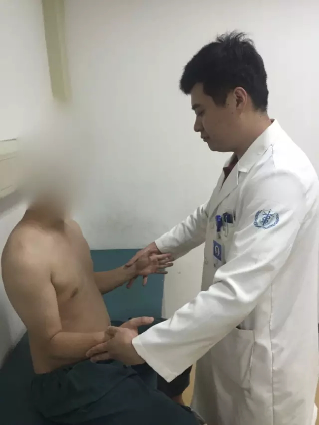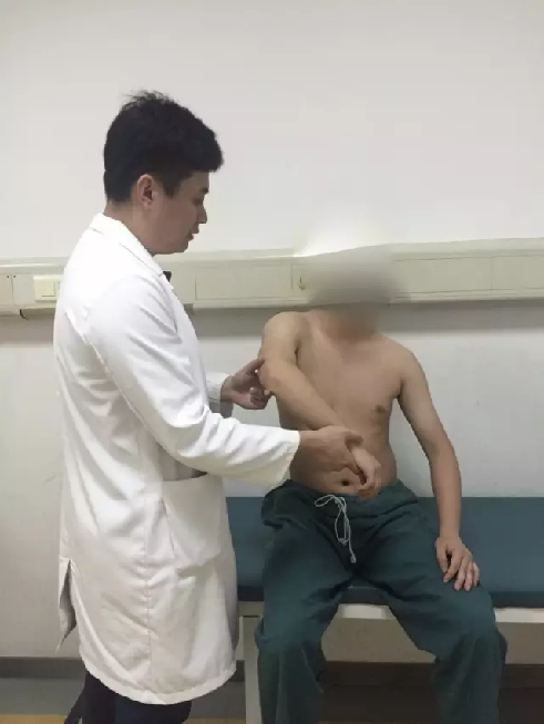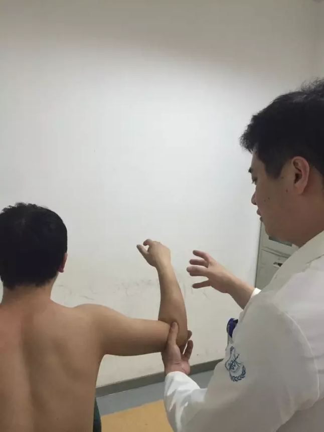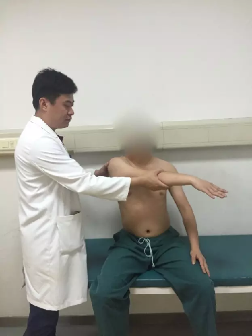 压腹试验:患者用手掌压住腹部,维持上肢于最大内旋位。如果主动内旋有力,肘关节不会向后掉落,肘关节位于躯体前方。