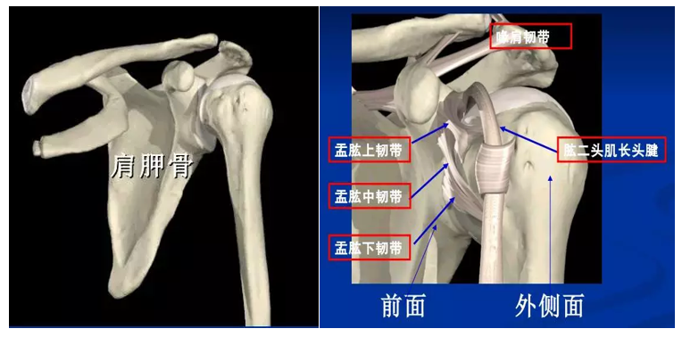 韧带是维持肩关节稳定性的静态结构,也是肩关节大角度运动的最主要稳定结构。肩关节韧带主要有盂肱上韧带、中韧带、下韧带、喙肩韧带和喙肱韧带。