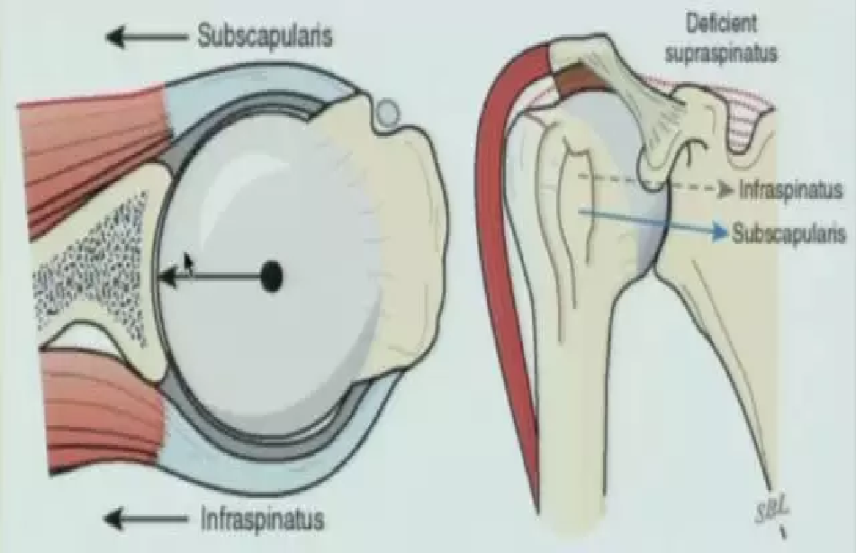 肩关节力偶:从解剖学角度讲,肩袖在肩关节的三维活动中起一定的作用。在冠状面,三角肌和肩袖下半部分(冈下肌、小圆肌、肩胛下肌)是一对力偶;在水平面,肩袖前部(肩胛下肌)和后部(冈下肌、小圆肌)之间是另一对力偶。