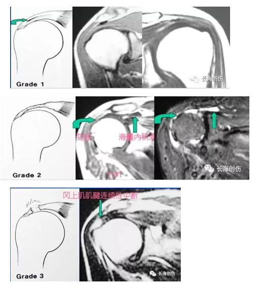 MRI 分级:0 级:正常的肩袖韧带在MRI上为均匀的低信号,是肌腱的延续;1 级:又称肌腱炎,这时肩袖的连续性是完整的,但是在冈上肌肌腱内见信号的增高。1 级的信号改变在质子加权图像中显示最为清晰,为中等信号。这种信号的改变最为可能是由于水肿、炎症反应和出血所引起的;2 级:T1WI或PDWI上见有信号增高并见肩袖的变细或不规则,滑囊内通常有积液;3 级:T2WI上信号增高涉及整个肌腱,肌腱连续性中断,滑囊内多有积液。
