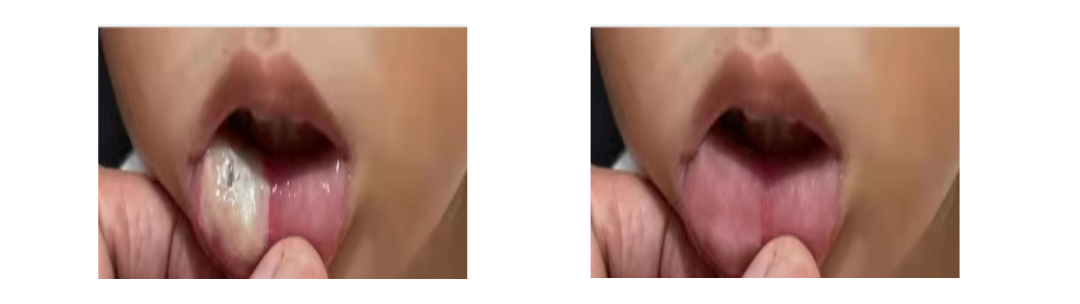 马× 5岁 右下前牙治疗时极度不配合,导致失活剂暂封不严,一天后暂封物脱落,失活剂溢出后灼伤下唇粘膜。(烧伤黏膜前后治疗图)