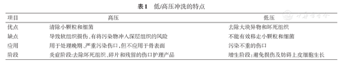 2.冲洗压力:低压力的伤口冲洗,难以清除伤口表面致密的纤维蛋白膜。压力过高可能导致继发损伤。一般而言,污染越重越需要采用更高压力冲洗(表1)。冲洗压力分级:低压为<5 PSI(磅/平方英寸),中压为5~8 PSI,高压为>8 PSI。