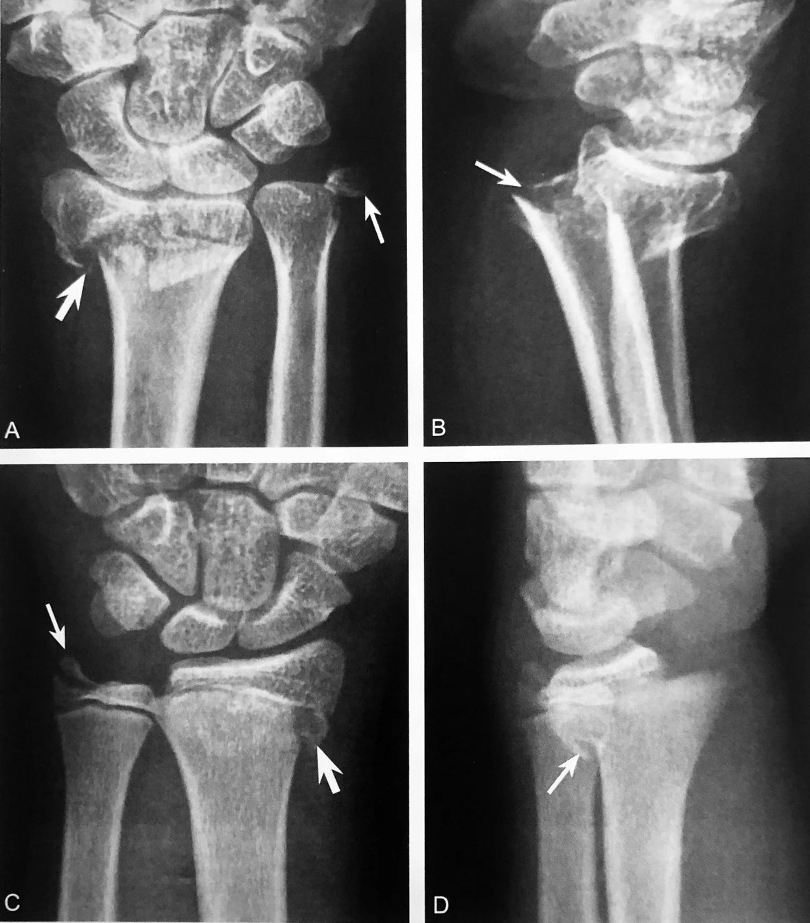 A~B.左腕关节ⅹ线正位及侧位。左桡骨远端骨折(粗箭头),尺骨茎突撕脱性骨折(细箭头),桡骨远端骨折背侧骨质嵌顿向掌侧成角(细箭头);C~D.右腕关节 ⅹ 线正位及侧位。桡骨远侧干骺端骨折伴骨骺向外侧移位(粗箭头),尺骨茎突部分撕脱(细箭头),桡骨远端骨骺向背侧移位,干骺端背缘碎骨片与骨骺相连(细箭头)