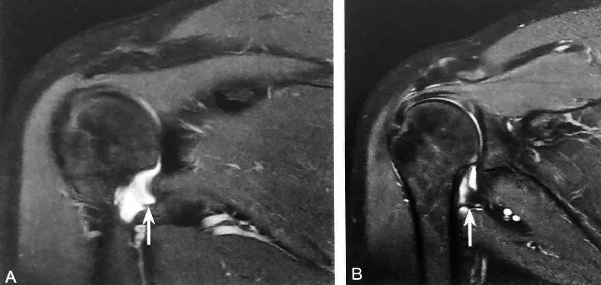 A、B 图为同一患者,抑脂 T2WI 示上盂唇周围两条线样高信号,其中一条高信号代表上盂唇的撕裂,另外一条指的是盂唇上隐窝,形成双曲奇饼征,提示上盂唇由前向后撕裂,即 SLAP 损伤(箭头所示)