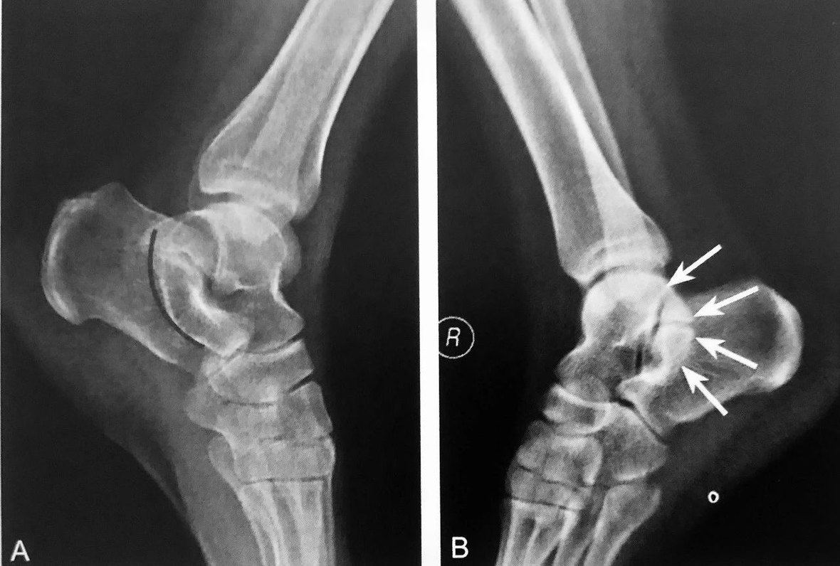 A 踝关节 X 线侧位,跟距骨桥形成,可见 C 征;B 踝关节 X 线侧位,距骨头与载距突边缘轮廓组成环状高密度影(箭头)