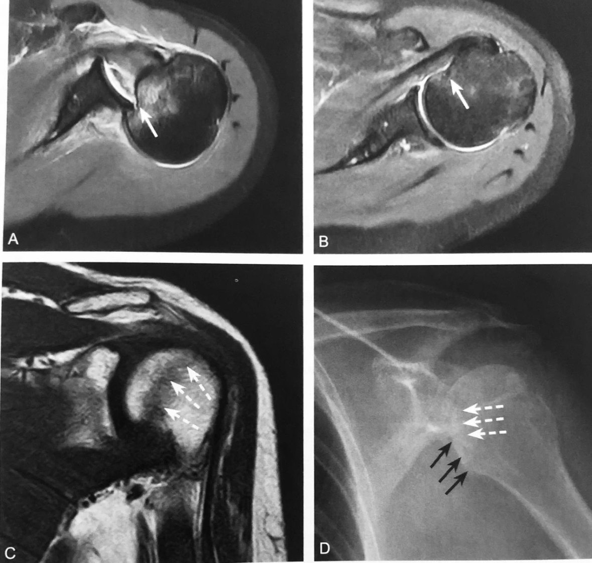 凹槽线:A~D 图为左肩关节后脱位的一位患者。A.左肩关节 MRI 横断位 T2WI 示:肱骨头内旋并嵌顿于关节盂后方,肱骨头前内侧凹槽样压缩骨折(白实箭头),并邻近骨髓水肿;B.左肩关节 MRI 横断位 T2WI 示:盂肱关节复位后肱骨头凹槽样形态仍存在(白实箭头);C.左肩关节 MRI 斜冠状位 T1WI 示:复位后肱骨头前内侧条形低信号影(白虚箭头)存在,提示撞击后损伤改变;D.左肩前后位 X 线示:肱骨头内侧皮质线形态(黑实箭头)和内侧皮质线外侧的凹槽线样改变(白虚箭头)