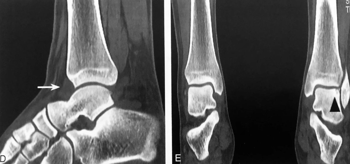2、距骨颈垂直骨折后(6±8)周在踝关节正位片或 CT 冠状位重建上观察;