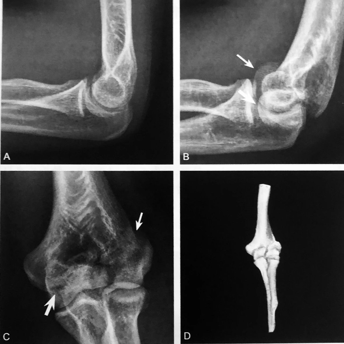 双弧征:A 图正常肘关节侧位 X 线图;B 图患者肘关节 ⅹ 线侧位片示肱骨远端可见两个弧形:一个弧提示肱骨小头游离(细箭头),另一个弧是肱骨滑车游离(粗箭头),双孤征提示肱骨远端冠状面 Dubberley Ⅲ 型骨折;C.同一患者肘关节 Ⅹ 线正位片可见肱骨小头骨皮质不连续(细箭头),肱骨滑车可见线状透亮影(粗箭头);D.CT 的VR 图像可见肱骨远端肱骨小头-滑车骨折