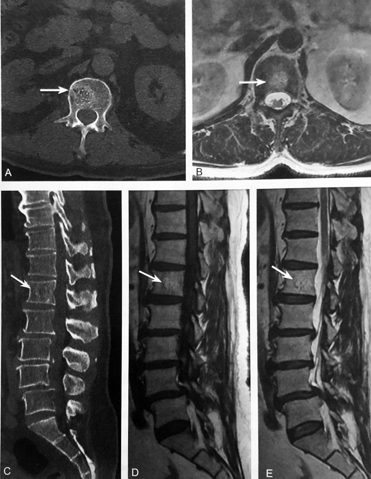 A.腰椎 CT 轴位示椎体内片状低密度区内多发点状高密度影,类似圆点形(箭头);B.T2WI 轴位示椎体内片状稍高信号区内多发点状低信号灶(箭头);C.腰椎 CT 重建矢状位示椎体内骨小梁条状增粗,周围间隔低密度区,呈“栅栏征”改变(箭头);D~E.T1WI 及T2wI 示椎体内片状稍长T2、稍短T1信号,病灶中心及周边见小点状、条状低信号区(箭头)