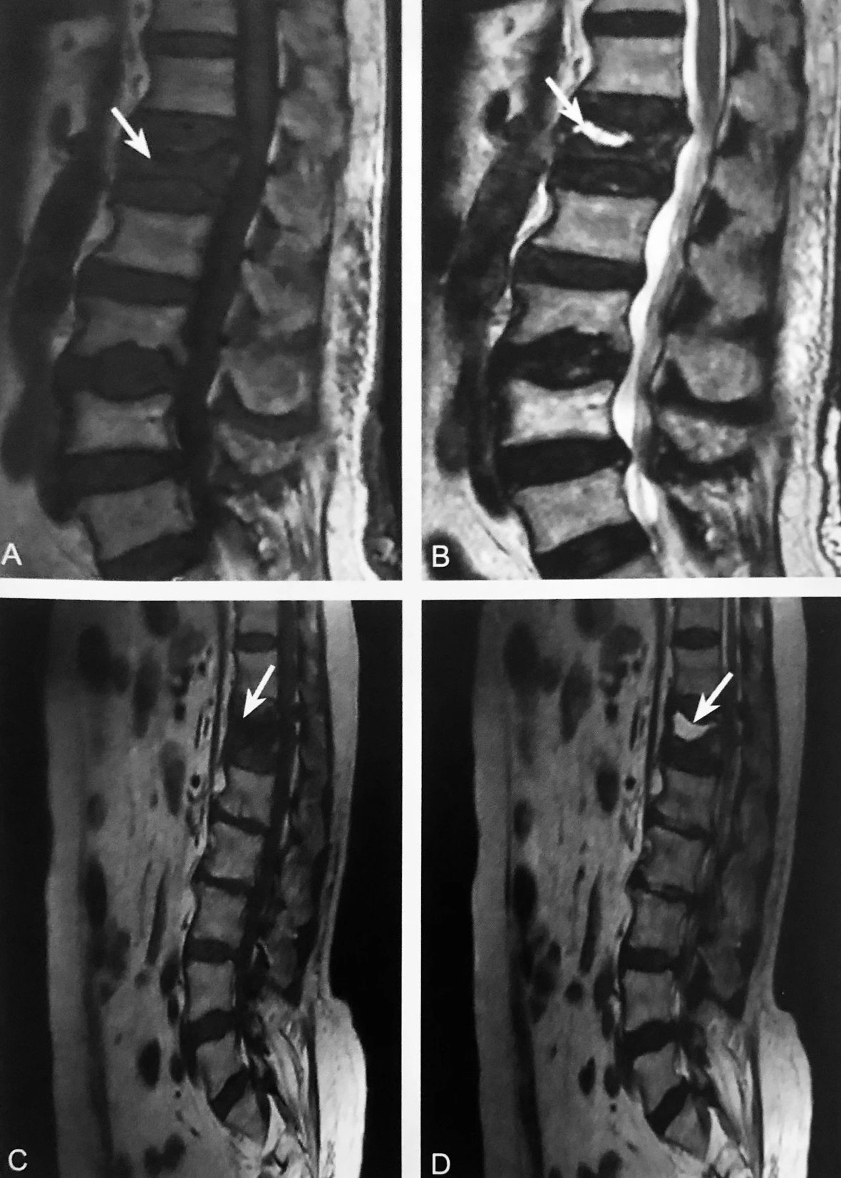 A~B.L1 椎体良性压缩性骨折,邻近骨髓水肿,T1WI 呈弥漫性低信号,T2WI 呈条带状高信号(箭头),位于 L1 椎体上终板下方;C~D.L1 椎体良性压缩性骨折,邻近骨髓水肿,T1WI 呈弥漫性低信号,T2WI 呈三角形高信号(箭头)