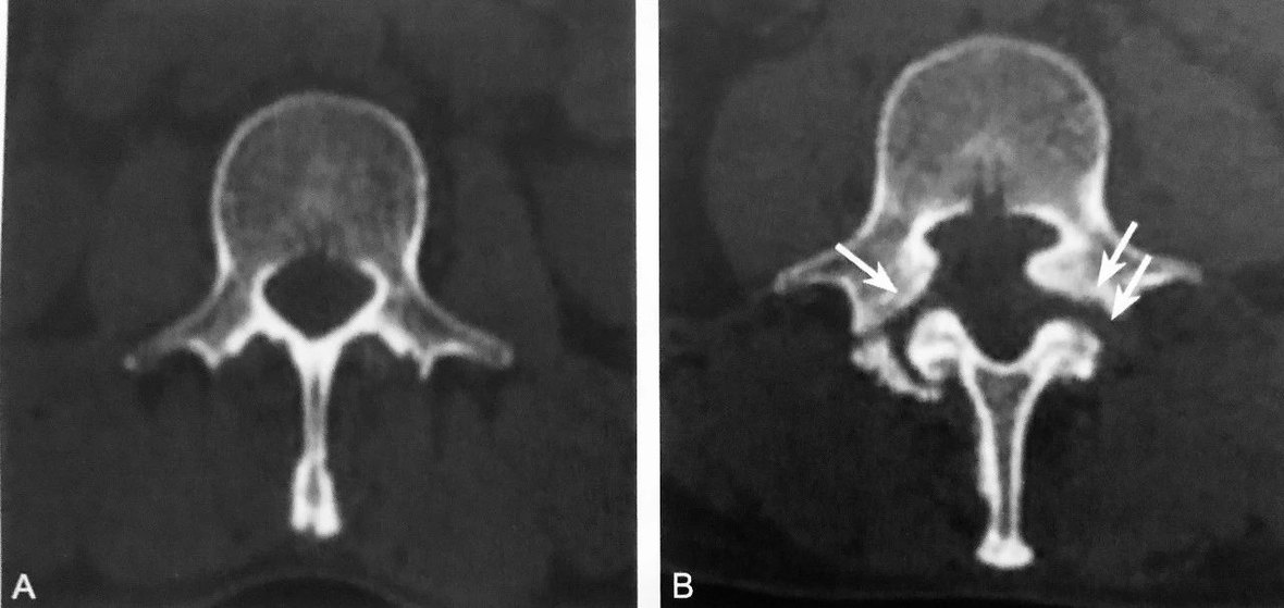 A.CT 横轴位图像,正常椎弓峡部层面骨性椎管呈完整环状结构,前部为椎体后缘,两侧为椎弓根序连于椎板,后部为棘突基底部围成;B.环裂征:双侧椎弓峡部崩裂(箭头),裂隙横跨峡部,断裂面形态不规则