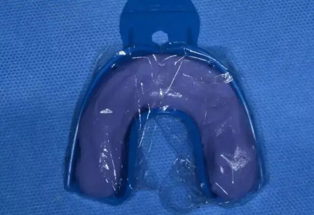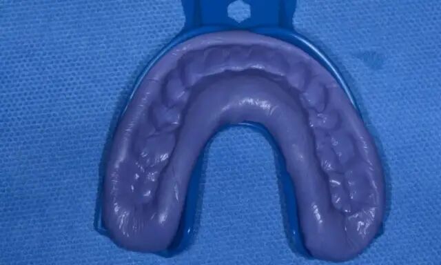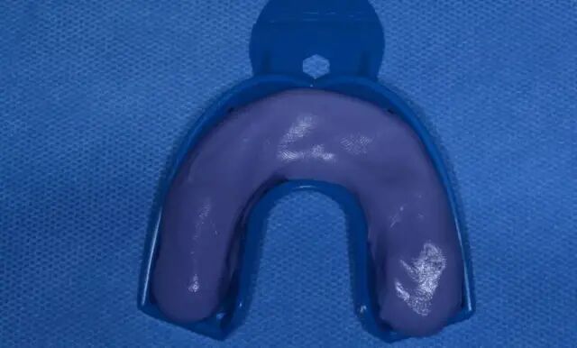 4、初印模结固后取出托盘,去除隔离膜。此时的印模还没有牙齿结构的细节,对于比较清晰的牙齿结构要用硅橡胶修整刀修除;