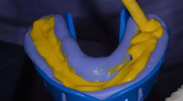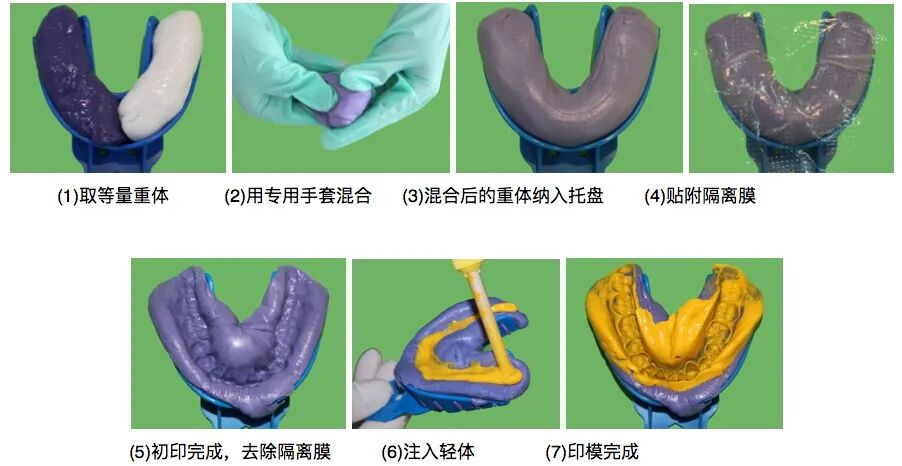 1、剪取比托盘稍大一些的塑料隔离膜。取等量重体印模材料,按生产厂家要求的时间定时。用指肚混合搅拌均匀,呈现均一颜色后,搓成条状填入托盘并覆盖至托盘的高度。确保在牙弓周围有足够的材料覆盖。托盘未端材料需要溢出一些,以取到最后磨牙的远中;