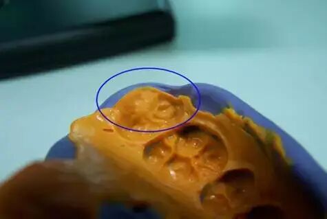 5)切勿为了填补气泡而在已经结固的印模中加入新的印模材料,这些后加的印模材料与原印模材料粘结性差,会导致印模产生皱褶及变形;