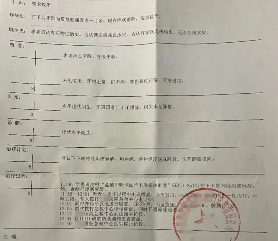 一位医生在行右下下颌神经阻滞麻醉,颊神经、舌神经浸润麻醉后,为患者切开翻瓣拔除智齿过程中,发生意外事故。