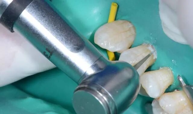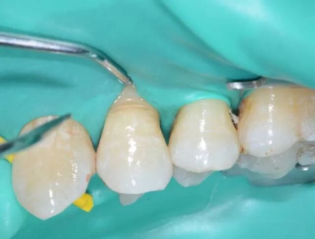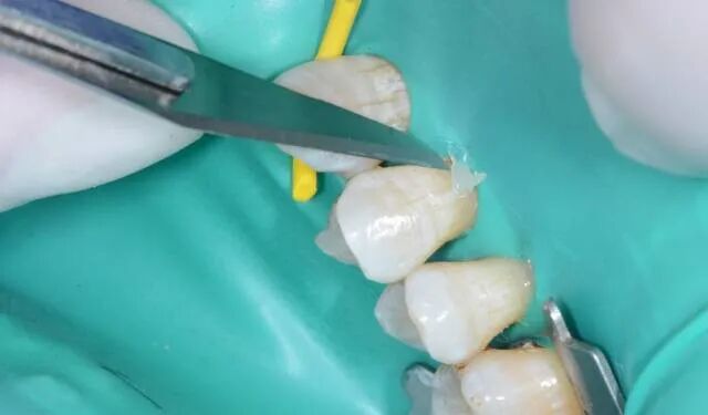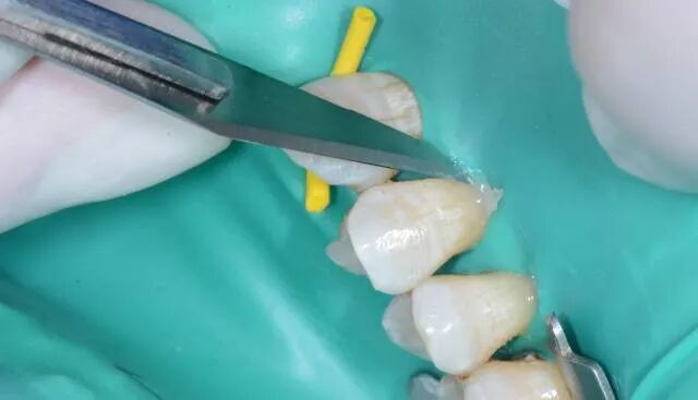手术刀休整树脂边缘 去除树脂突,并清理根面残留粘结剂