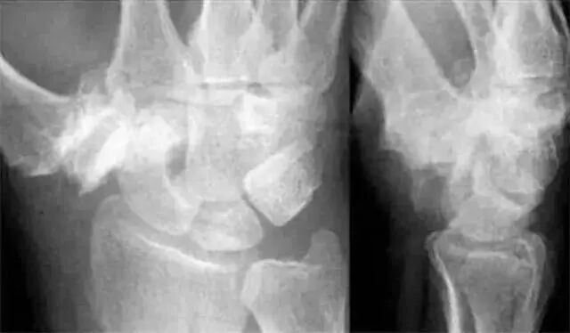 5)混合型脱位:月骨周围脱位,月骨也有半脱位。甚至有腕骨骨折、尺桡骨骨折、尺桡下关节脱位等。