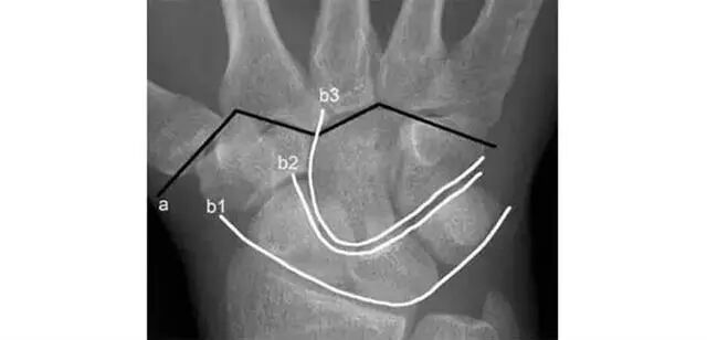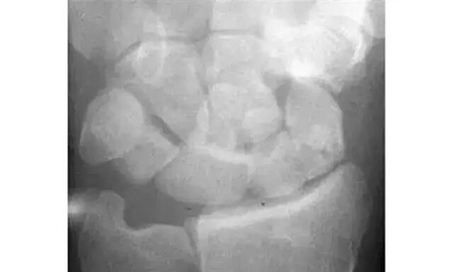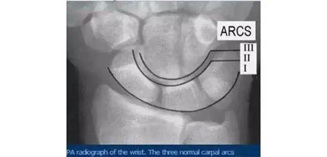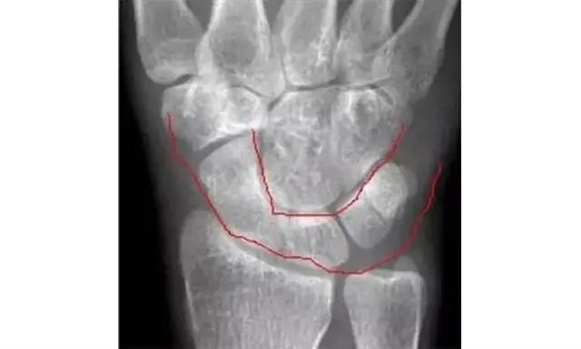 若显示腕骨弧线不连续或各弧线不平行,或腕掌线M形结构消失,应高度怀疑腕关节不稳或脱位。