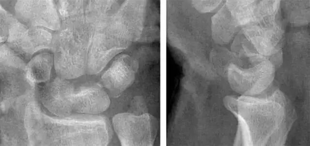 看是否有骨折:主要以舟骨、月骨常见,其他腕骨骨折一般较少,侧位注意不要漏诊三角骨即可;看桡骨远端不要漏诊关节面和纵行小梁的骨折。