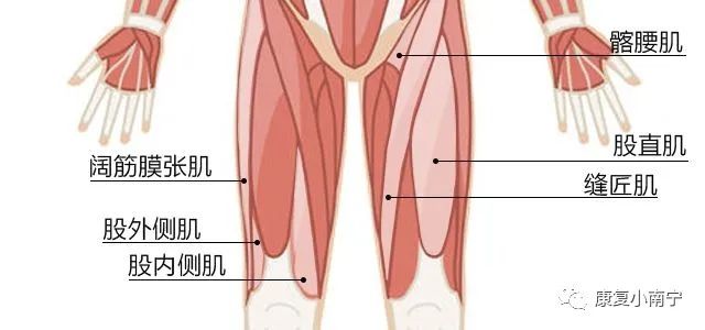在身体的正面往后看会有:腹直肌、腹外斜肌、腹横肌、梨状肌、腹内斜肌、腹股沟韧带。