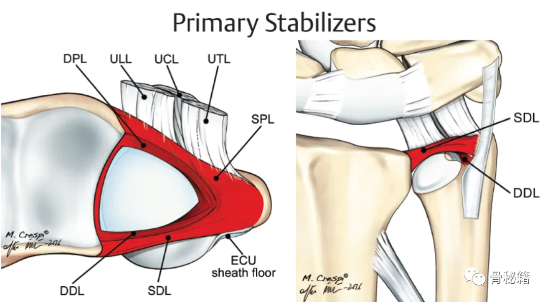 DDL,深背韧带;DPL,掌深韧带;ECU,尺侧腕伸肌;SDL,背浅韧带;SPL,掌浅韧带;UCL,月头韧带;ULL,尺月韧带;UTL,尺三角韧带。