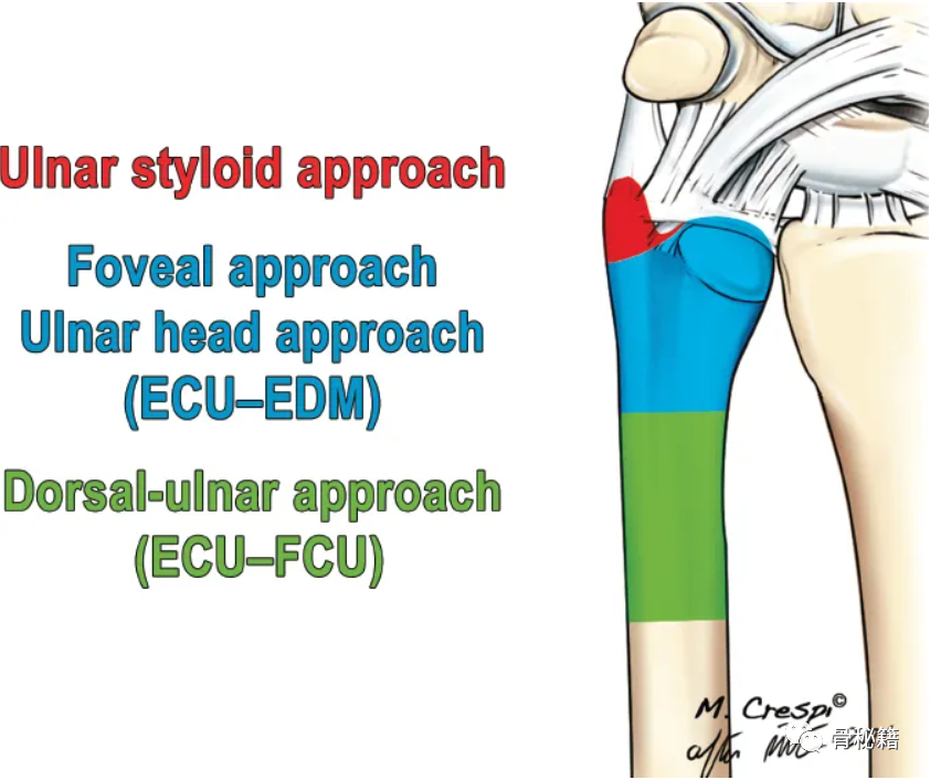 尺骨茎突入路(红色):用于尺骨茎突骨折