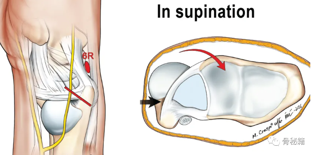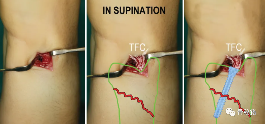 通过一个 1.5 到 2 厘米的切口,从茎突底部的背侧近端到掌侧远端切开,注意不要损伤尺神经,保持尽量旋后的状态,也可通过该入路重建TFCC