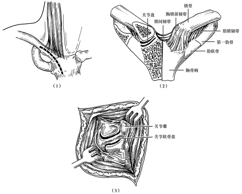(1)切口;(2)显露肋锁韧带及胸锁前韧带;(3)切开关节囊,显露关节盘
