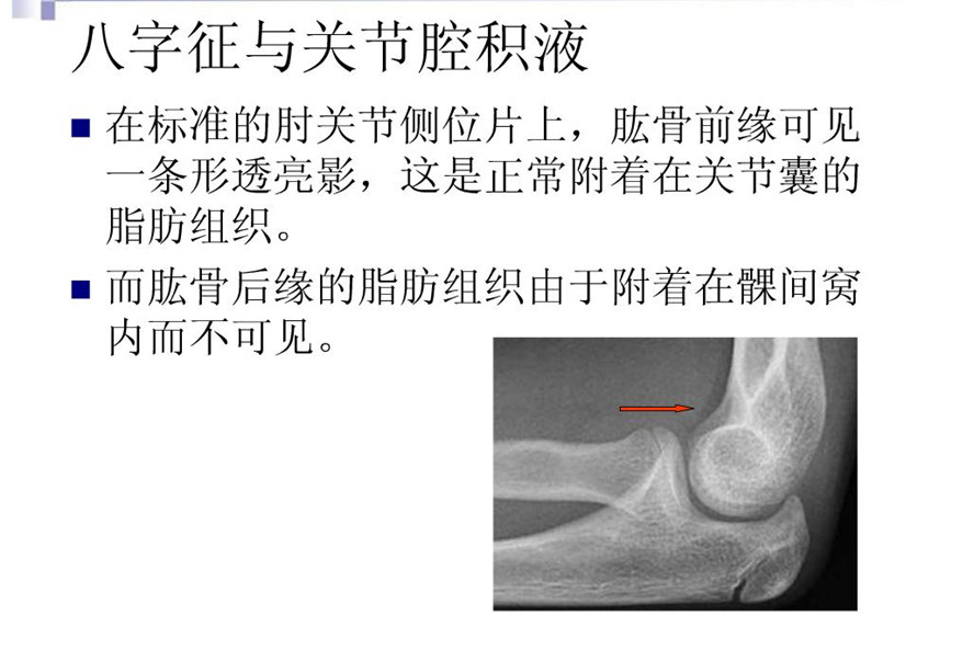 1.在标准的肘关节侧位片上,肱骨前缘可见一条形透亮影,这是正常附着在关节囊的脂肪组织。