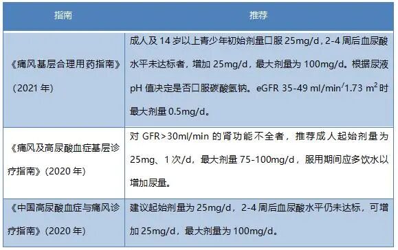 痛风是因血尿酸过高而沉积在关节、组织中造成多种损害的一组疾病,与嘌呤代谢紊乱或尿酸排泄减少所致的高尿酸血症直接相关,属于风湿病范畴。目前降尿酸药物主要是抑制尿酸生成药物即黄嘌呤氧化酶抑制剂(XOI)(如别嘌醇、非布司他)、促尿酸排泄药物(如丙磺舒、苯溴马隆,一般需多饮水及碱化尿液)。对单药最佳剂量疗效欠佳者,建议XOI和促尿酸排泄药物联用。本文总结了近几年痛风和高尿酸血症诊治指南有关别嘌醇、非布司他、苯溴马隆的使用细则,以期为临床用药提供参考。