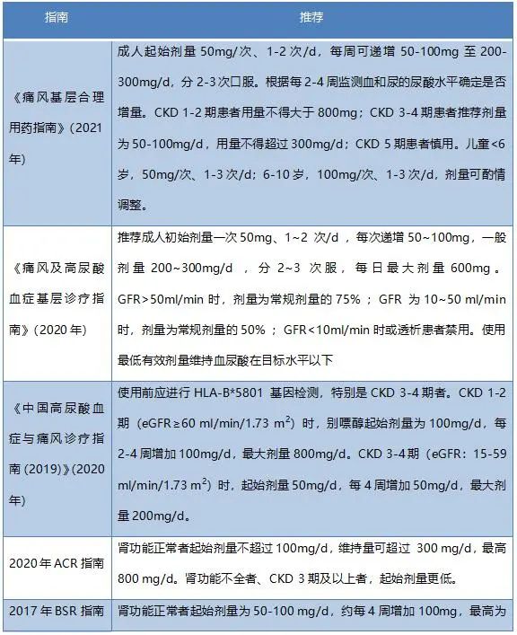 别嘌醇可引起胃肠道反应、肝肾损害、骨髓抑制、过敏反应等。禁用于CKD 5期(eGFR<15 ml/min/1.73m2)、明显血细胞低下、HLA⁃B*5801阳性者。携带HLA-B*5801基因型比例高者,建议在使用别嘌醇前进行HLA-B*5801基因检测。