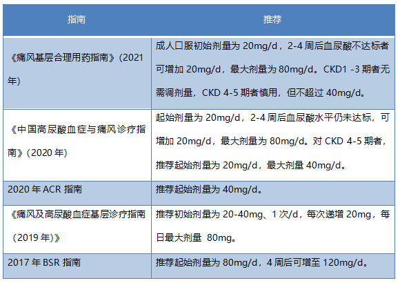 非布司他属于选择性、特异性XOI(抑制氧化型和还原型的黄嘌呤氧化酶),有良好的降尿酸效果,其抑酸和降酸作用更强大、持久,抑制尿酸合成的作用强于别嘌醇,同时肾脏的保护作用更佳,尤适于慢性肾功能不全者,建议eGFR<30 ml/min/1.73 m2时优先考虑非布司他,也可用于别嘌醇过敏或HLA-B*5801基因阳性者。此外,还可协同降压,不抑制其他参与嘌呤和嘧啶合成与代谢的酶。《中国高尿酸血症与痛风诊疗指南》(2020年)推荐非布司他作为痛风患者的一线降尿酸药物。