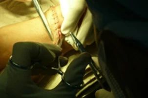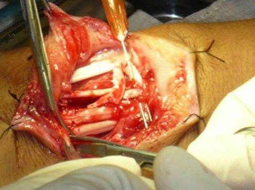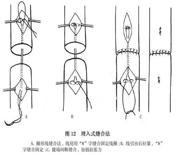 - 选用36#~38#钢丝或5-0无创伤钢丝肌腱缝合线。肌腱近断端用“8”字缝合,经肌腱远端穿出皮肤并用纽扣固定在皮肤表面,以减少肌腱断端结合部张力。4周后.用剪刀将纽扣下的钢丝剪断,从近端将钢丝抽出。