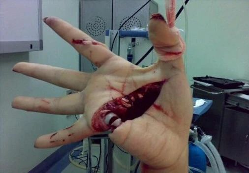 Ⅱ区:中节指骨中部至掌骨颈部,常被称为“无人区”(no man’s land),拇指为近节指骨颈到掌骨颈,即腱鞘区。