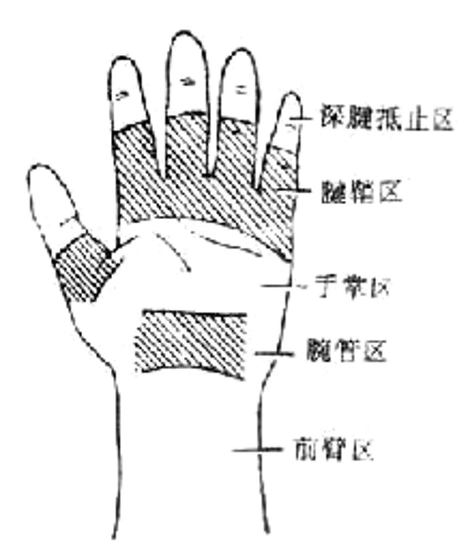 Ⅲ区:“手掌区”,即从掌骨颈部到腕横韧带的远侧缘。