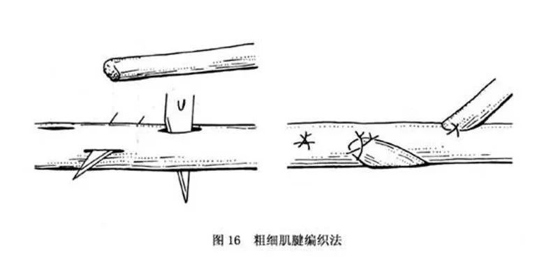 先将近侧屈肌腱引出,为防止回缩,可用注射针头在其近侧1.5~2cm处横穿腱鞘将其别住。深腱与浅腱应保持在一起,以便不阻碍相互血运的联系,先在深腱上作半个Kessler或采取其他缝法,线头从断端处引出作为牵引用。浅腱当视其断裂在Camper交叉的什么部位再决定具体修复法。断裂在交叉以远,则两股肌腱分别作“8”字缝合;断裂在交叉以近,采用:Kessler法缝合即可,务必使表面光滑。