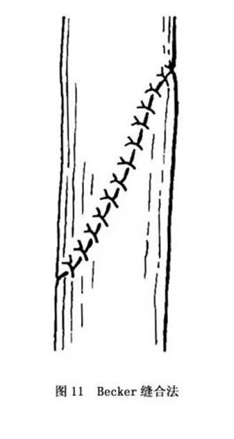 - 将肌腱断端剪成斜面,用5-0无创伤单丝线,间断缝合。此法抗张力较强,因缝合线较多,肌腱端需重叠,肌腱长度受到影响,适用于肌腱异位缝合。