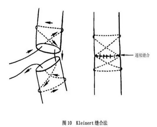 - 用3-0无创直针单丝线缝合,缝合方法简便,抗张力较强,对肌腱断端血循环干扰少。为了使断端缝接处平滑,抗张性更好,在周边间断缝合。