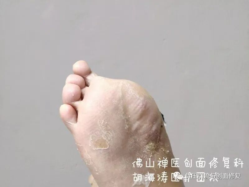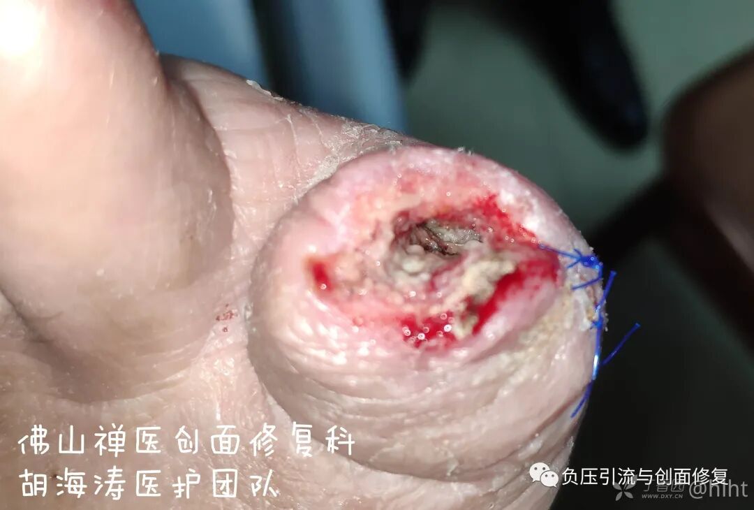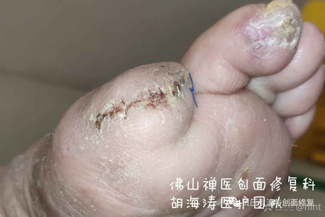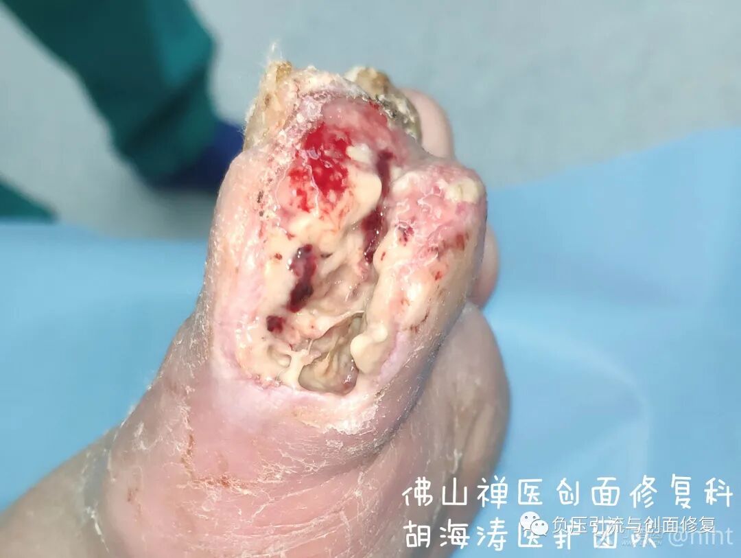 多年前遇到类似患者,主刀医生第一次手术时,扩大清创,完全切除第一足趾,使用筋膜皮瓣修复创面,手术切口一期愈合,住院时间2周;