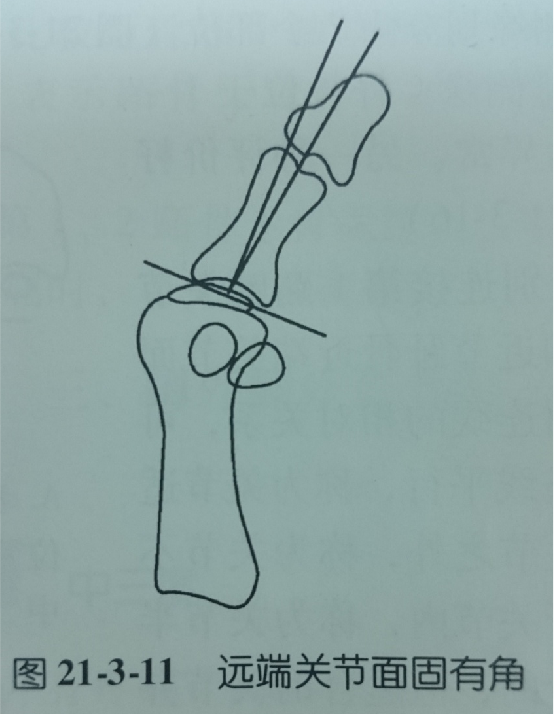 远端关节面固有角(DASA) 通过近端趾骨中线与趾骨近端关节面连线交点引关节面连线的垂线,该垂线与近端趾骨中线之夹角。正常人一般<7.5°