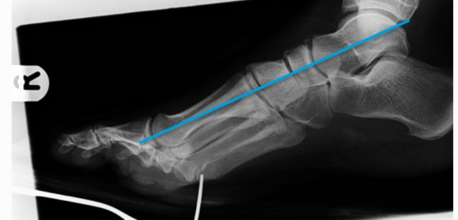 第1、2跖骨关系 分别画出第1、2跖骨干背侧缘,比较两者之间的关系。正常时,两重叠或平行。在第1跖骨头背伸或跖屈时,可见两者成角。