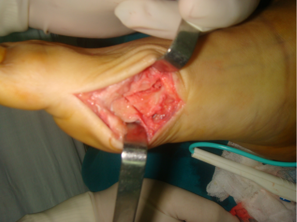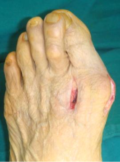 - 切除第1跖骨头内侧骨赘和拇囊。