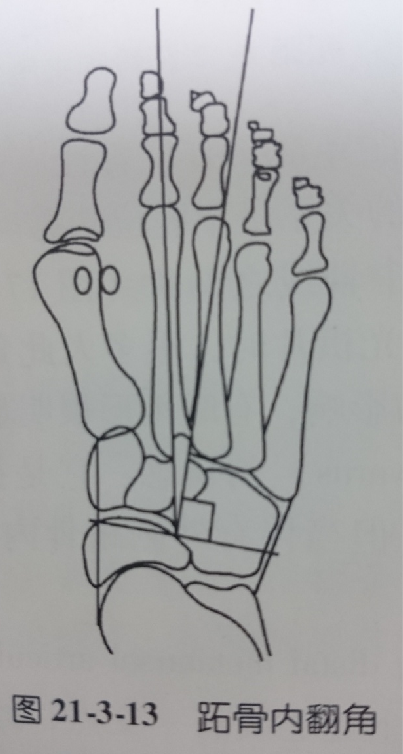 2:侧位片观察和测量第1跖骨倾斜角 第1跖骨中轴线和地面水平线的夹角。正常约为15°。此角对于术前选择手术方式意义不大,可以作为术后判断第1跖骨位置的一个参考。
